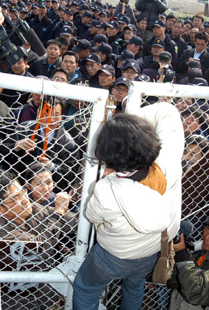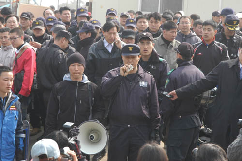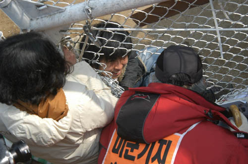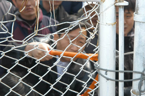 | ▲ 쇠사슬을 이용해 철조망에 팔을 묶어 경찰의 진입을 저지하려 하고 있다. 이에 경찰은 정문진입을 포기하고 학교 뒤편으로 진입을 시도했다. ▲ 쇠사슬을 이용해 철조망에 팔을 묶어 경찰의 진입을 저지하려 하고 있다. 이에 경찰은 정문진입을 포기하고 학교 뒤편으로 진입을 시도했다. |