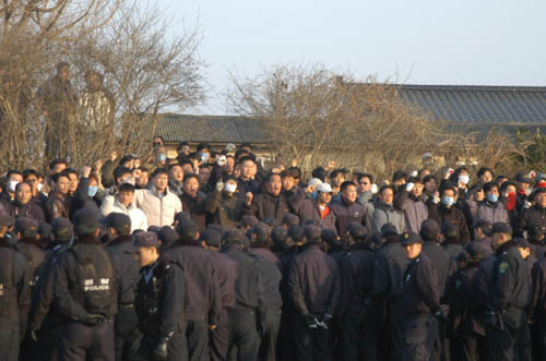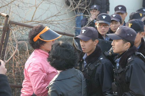 ▲ 학교 뒤편에 진입하려는 경찰이 주민과 시민사회단체 회원들에게 막혀있다.