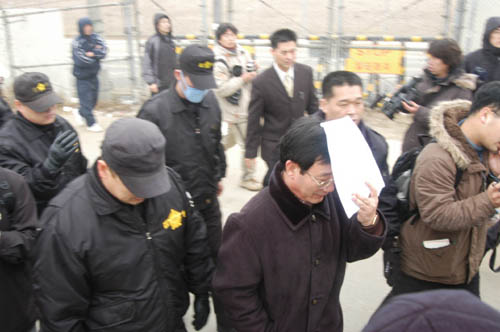 ▲ 법원 집달관이 얼굴을 가린 채 용역업체 직원들과 함께 대추분교로 이동하고 있다.