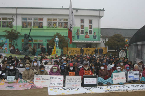 ▲ 학교 건물 앞에서 집회를 열고 있는 주민들