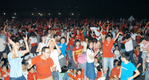 우리시에서도 공식 거리응원 장소인 합정레포츠공원과 이충레포츠공원, 현화택지내 제2근린공원에 모인 1만여명의 시민들은 ‘대~한민국’과 ‘오 필승 코리아’를 목청껏 외치며 기쁨을 만끽했다.