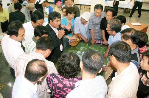 평택화양지구 도시개발조합을 비롯해 최근에는 학현지구도 도시개발추진위를 결성해 개발을 추진하고 있다. 사진은 화양지구 조합원들이 조합총회를 마치고 조합원들의 땅에 건설될 신도시 모형물을 살펴보고 있다.