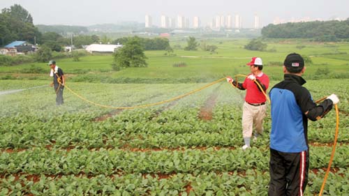 녹음이 짙은 여름 한낮에 농부가 현덕면 화양리에 있는 자신의 열무밭에서 땀을 흘리며 아들과 함께 농약을 뿌리고 있다. 열무밭의 주인인 배웅렬(안중읍 안중리)씨는 “아직까지는 작황이 좋지만 장마기간 아직 남아있어 걱정이 앞선다”고 했다.