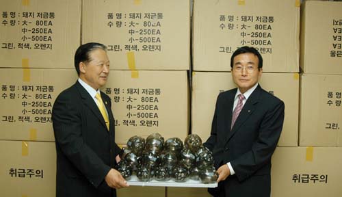 10일 권범택 조합장과 김철수 상무 등 평택농협 관계자들은 평택연탄나눔은행 사무국을 방문, 검은색 돼지 저금통 1만3천개를 김성환 공동대표에게 전달했다.