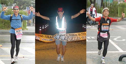 ‘2007년 한반도횡단 308km(강화-강릉)’ 울트라마라톤 대회에 출전한 ‘평택 철각’ 강종의, 공재구, 이강선씨(왼쪽부터)가 종료지점인 강원도 강릉시 경포대해수욕장에 들어서고 있다.