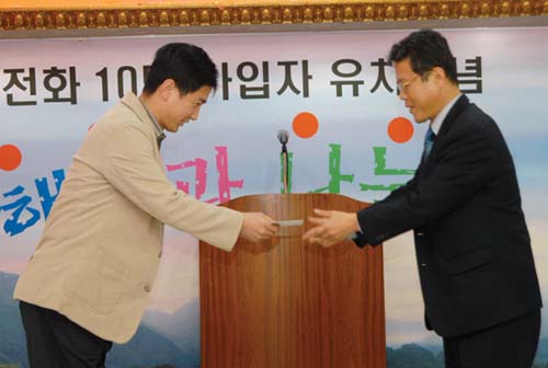 16일 비전부페에서 열린 ‘SKT 이동전화 10만 가입자 유치기념식’에서 이재덕 대표는 평택연탄나눔은행을 비롯한 성육보육원 등 총 7개 사회복지시설 및 단체에 후원금 약정서를 전달했다.