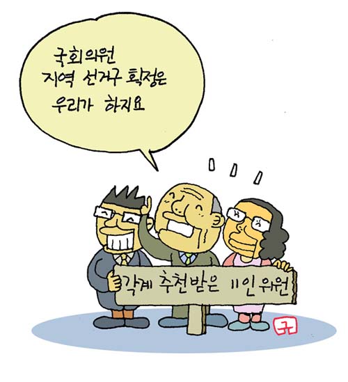 국회의원지역선거구의 공정한 획정을 위하여 국회에 국회의원선거구획정위원회를 두며, 국회의장은 교섭단체대표의원과 협의하여 국회의원, 지방의회의원 및 정당의 당원을 제외한 학계·법조계·언론계·시민단체 및 선거관리위원회가 추천하는 자 중에서 11인 이내의 위원으로 구성하도록 하고 있습니다.