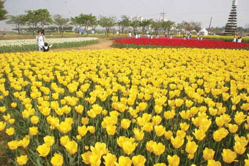 농업기술센터 앞 터에 핀 다양한 색상의 튤립이 꽃잎을 활짝 펴고 ‘2007 평택 꽃 봄나들이’ 행사를 찾은 시민들을 반기고 있는 가운데, 29일 오후 아이와 함께 방문한 한 시민이 튤립을 배경으로 사진촬영을 하고있다. ‘평택 꽃 봄나들이’ 행사는 다음달 5일까지 이어지며, 부대행사도 함께 준비되어 있어 가족이 함께 가면 좋다.
