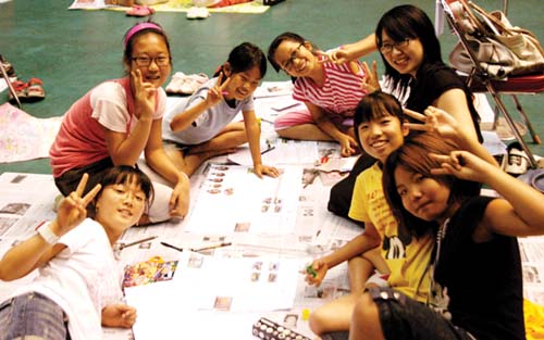 참가자들은 대회장 마룻바닥에 자리를 깔고 준비해온 문방구를 이용해 신문을 제작했다.