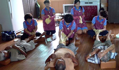 “처음에는 남의 발을 만진다는 것이 어색하고 거북한 마음도 들었다”고 토로한 노 회장은 해가 가면서 점차 느껴지는 보람이 훨씬 크다보니 이젠 오히려 화요일을 기다리게 될 정도란다. 특히 발마사지가 끝날 때 마다 어르신들이 고개 숙여 인사하며 건네는 진심어린 고맙다는 한마디에 힘이 난다고. 20여 부락을 다 도는데 걸리는 시간은 대략 3개월로 1년에 4차례씩 찾아뵙는 셈인데 마을을 다닐 때 마다 밥을 해주시는 어른들이며 먹을 것을 권하는 이장님까지 다양하다. 평소 병원에 다니시는 어르신들도 이 날만큼은 병원대신 이곳으로 찾아와 차례를 기다린다고 전했다.