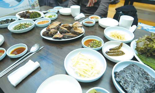 음식이 나왔습니다. 기본 반찬이 놓이고, 물미역과 석목이라는 해초도 보입니다. 석목은 갈색으로 파래와 톳의 중간쯤 합니다.