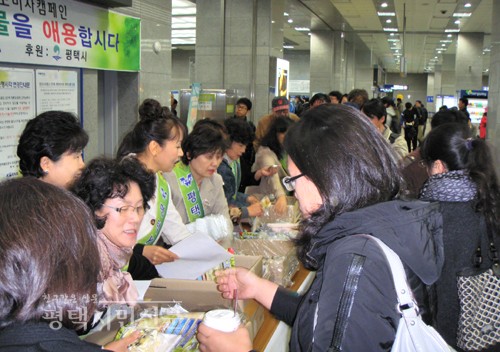 평택YWCA가 지난 26일 평택역을 지나는 시민들의 아침을 건강함으로 깨웠다. 평택YWCA가 건강한 아침을 위해 선택한 방법은 지나는 시민들에게 평택에서 나는 쌀로 만든 떡을 건네는 것. 덕분에 시민들의 표정에도 생기가 넘쳤다. 평택YWCA가 이와 같은 홍보를 펼친 것은 로컬푸드 사업 ‘맛있는 식탁’을 시작했기 때문.