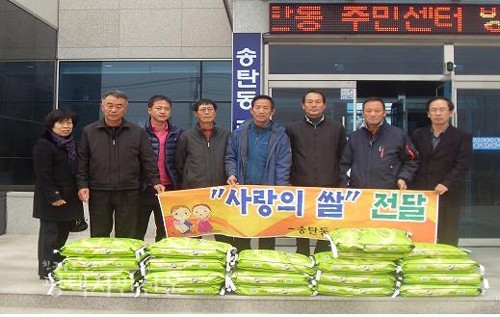 송탄동(동장 현진수) 통장협의회(회장 최수웅)는 지난 6일 어려운 이웃들을 위한 사랑의 쌀 전달식을 가졌다. 이번 행사는 송탄동 통장협의회가 관내 농지 3,000여평을 무료임대 후 6월 부터 11월까지 콩을 재배하여 약 1,000kg가량을 수확하여 마련한 것으로 콩 판매 수익금으로 쌀을 구입(20kg/20포)하여 관내 각 경로당에 전달했다.