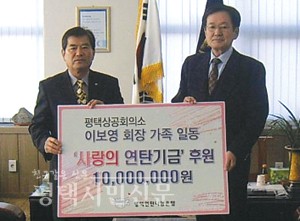 한편, 성금을 전달받은 이종영 공동대표는 “이번 기부가 지역의 모범적인 선행사례가 되어 우리 평택에서 사회지도층의 아름다운 나눔 문화 확산의 계기가 되었으면 하고, 이를 바탕으로 밝은 평택을 만들어 가도록 노력하겠다”며 이 회장과 가족들에게 감사의 말을 남겼다.