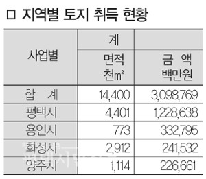 지역별로는 평택이 440만㎡의 토지를 취득하며 1조2286억 원을 보상해 경기도 31개 시·군 중 가장 많았고, 그 다음을 용인, 화성, 양주가 이었다.