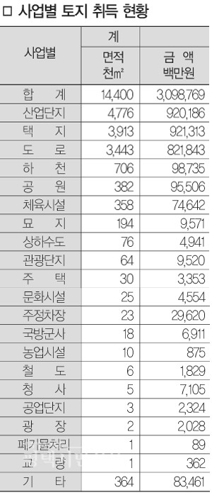 사업유형별로는 택지개발사업 391만3000㎡의 공공용지 취득에 9213억 원을, 산업단지사업 477만6000㎡에 9202억 원을, 도로사업 344만2000㎡에 8218억 원을 보상해 상위 3개 사업유형이 토지보상액 전체의 86%를 차지하였다.