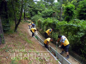 지산동 자율방재단(단장 곽영관)은 지난달 29일 본격적인 장마철에 대비하기 위해 지산동 아파트 밀집지역에 위치한 송탄근린공원 배수로 정비를 실시했다. 지산동 자율방재단원 등 20여명은 30도가 넘는 무더위 속에서 구슬땀을 흘려가며 3Km 길이의 배수로에 쌓인 토사와 낙엽 등을 정비했다.