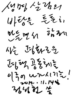 평택의 현안이 뭔지 몰라 답변하기 쉽지 않지만 결국 근본에 대한 성찰이 필요해요. 평택이 가지고 있는 근본 문제가 뭔지 시민들이 생각해보세요. 아마 근본은 생명의 위기일거예요. 하늘과 땅과 바다의 죽음이지요. 평택도 생명을 살리는 일을 지역의 근본가치로 해야 돼요. 인간과 자연의 평화, 미군기지와 주민의 공존에 시민들이 함께 해야겠지요.