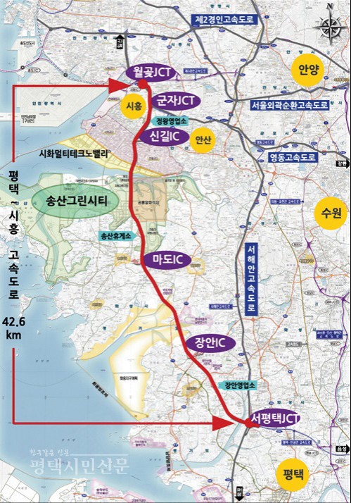 평택시 청북면에서 시흥시 월곶동까지 이어지는 평택-시흥 고속도로(제2서해안고속도로)가 오는 29일 개통된다. 이번 개통되는 평택-시흥 고속도로는 총 사업비 1조1600억 원을 들여 42.6km 구간에 JCT 2개소, IC 3개소, 휴게소 1개소(송산휴게소) 등 주요시설을 갖췄다.