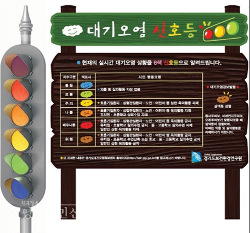 연구원이 올 초 개발해 연구원 인근 광교산 등산로 입구에 설치 운영하고 있는 ‘대기오염 신호등’은 대기오염 정도에 따라 6가지 색상으로 위험도를 표기한 것이다.