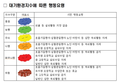 대기오염 정도 6가지 색으로 알기 쉽게 표기