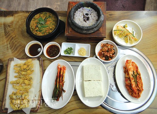 ‘엄니 토종 추어탕’의 기본 메뉴인 돌솥 추어탕(8000원)상차림은 잡곡이 들어간 돌솥밥과 펄펄 끓는 뚝배기추어탕, 두부 한 접시, 상큼한 배추겉절이, 산뜻한 파김치, 고소한 추어 튀김, 매콤한 어리굴젓, 삼삼한 콩나물 무침, 간장 등으로 구성되어 있다.