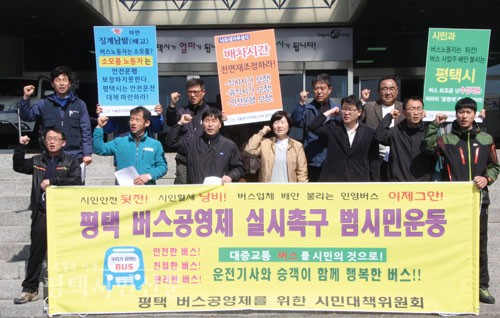 이에 대한 해결책으로 지난 29일 평택 버스공영제를 위한 시민대책위(진보신당 평택안성당원협의회, 평택민주단체연대회의, 평택참여자치시민연대)는 평택시청 정문 앞에서 공영제 실시를 촉구하는 기자회견과 범시민운동 개시를 선포했다.