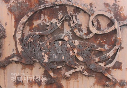 ‘역사의 시간’은 고구려 무용총에 그려진 ‘수렵도’, 강서대묘의 ‘현무’ 등을 양각으로 표현했다. 작품은 군데군데 페인트가 벗겨지고 붉게 녹이 슬었다. 비바람에 부식되어가는 작품이 시간 안에 갇힌 우리네 사람과 많이 닮았다.