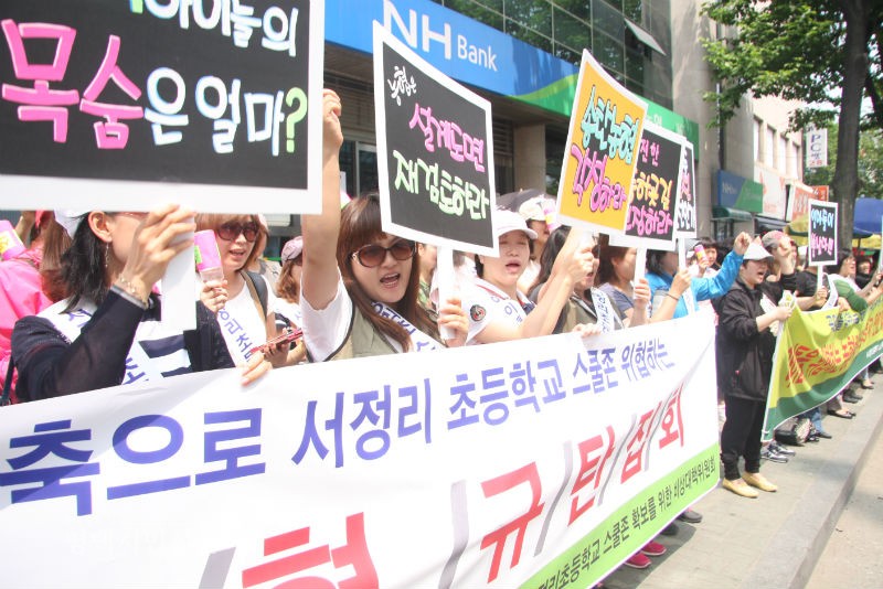이날 집회에는 서정리초 운영위원회와 학부모회, 총동문회 관계자 등 50여 명이 참석해 하나로마트 신축공사 추진을 규탄하는 성명을 발표했다.