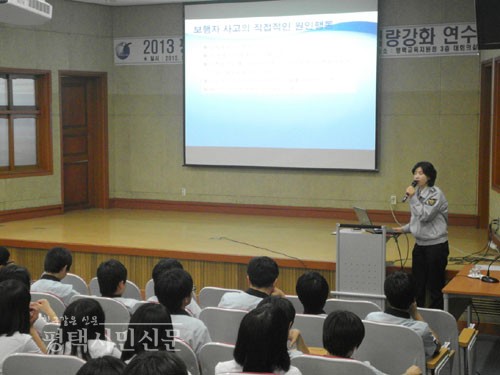 이날 교육은 보행 중 휴대폰을 사용하는 잘못된 습관 바로잡기와 자전거·이륜차 올바르게 타기 등 교통안전수칙에 대한 동영상 시청으로 진행됐다.