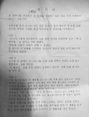 이날 워크숍에 앞서 이 농협 감사가 작성한 것으로 보이는 2장 분량의 ‘경위서’를 배포했다가 외부 노출을 우려해 곧바로 회수했다.