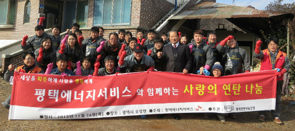평택에너지서비스 오성발전소(대표 박영덕)는 지난 11월 26일 임직원 30명이 참여한 가운데 평택연탄나눔은행에 사랑의 연탄 4000장을 기부하고, 당일 오성면 일대 4가구에 연탄을 직접 전달했다.‘이웃과 함께 따뜻한 세상을 만들어 간다’는 기업 이념을 지닌 평택에너지서비스는 연탄나눔 외에도 김장김치 등 다양한 지역사회공헌활동을 펼치고 있다.