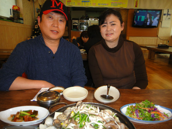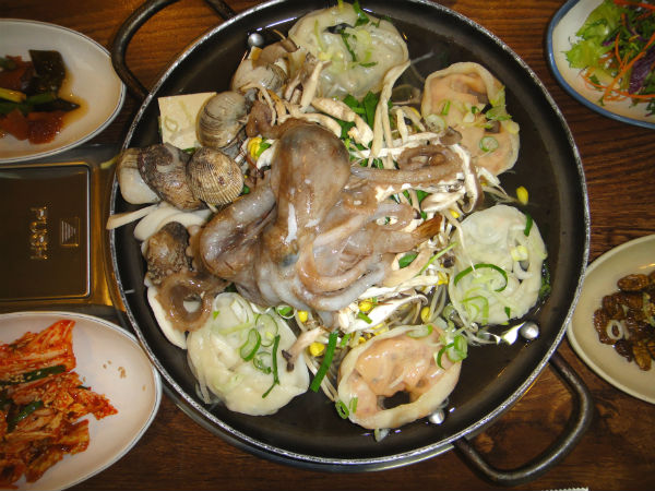 가스불이 켜지고 큼직한 전골냄비에 푸짐하게 담긴 만두와 야채 등의 부재료 위에 살아 꿈틀거리는 낙지 한 마리가 얹혀 있다. 아직은 가스 불에 냄비가 달구어지지 않은 상태, 바다로 돌아가고 싶은지 꿈틀꿈틀 냄비 밖으로 기어나가는 낙지를 맨손으로 잡아넣는다. 그 낙지를 끓기 시작한 해물만두전골 속에 살짝 익혀 먹는데, 야! 금방 힘이 솟는 것 같다. 쓰러진 소도 벌떡 일으킨다는 낙지를 와사비 간장에 찍어 먹으니 맛도 기분도 그야말로 짱이다. 이어 만두, 조개, 바지락, 떡국, 새우, 두부, 콩나물, 파 등으로 구성된 뜨거운 전골을 후후 불어가며 차례대로 먹는다. 그 사이에 잘 익은 만두를 건져먹는데 오랜만에 제대로 만들어진 만두를 먹는 것 같다.