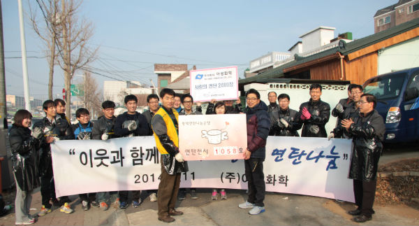 칠괴산업단지 내 위치한 (주)아성화학은 지난 11일 지역의 어려운 이웃에게 뜨거운 사랑의 연탄을 전달하며 1058호 연탄천사가 됐다.