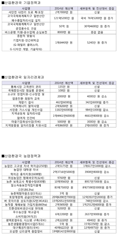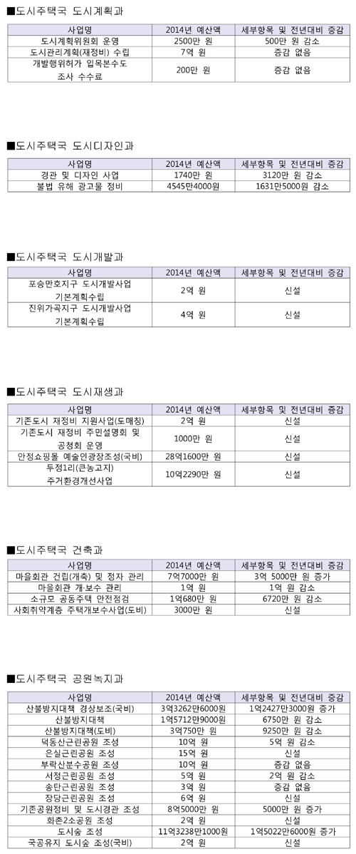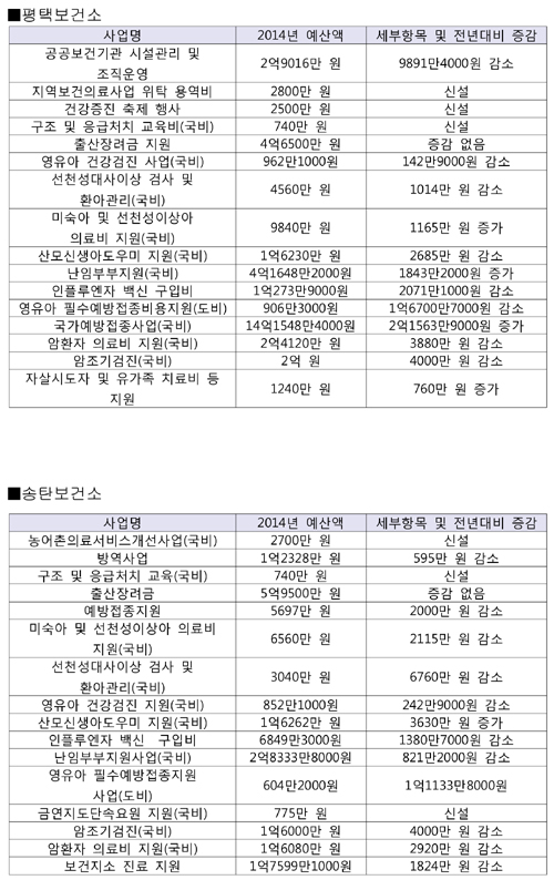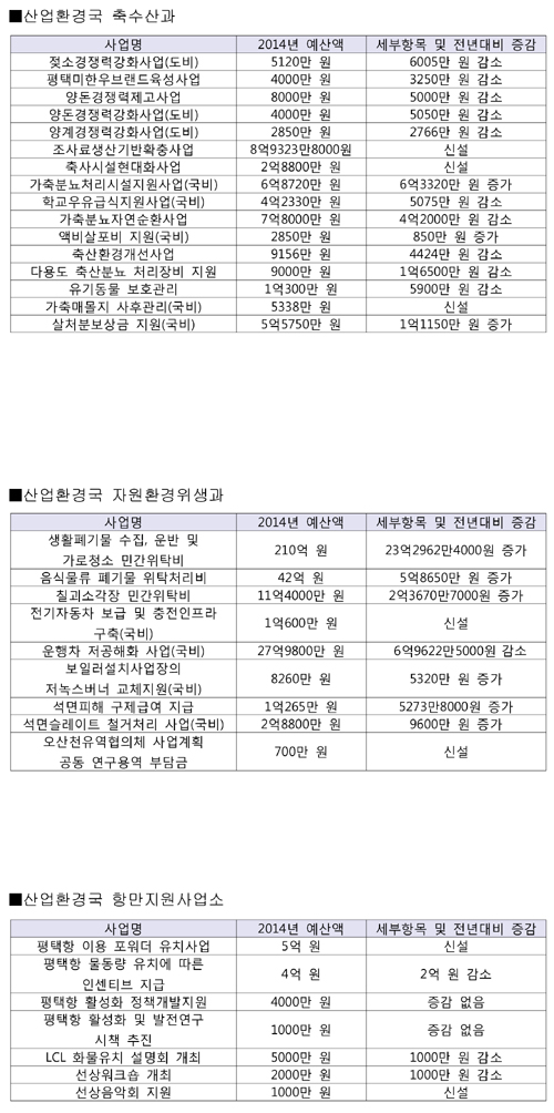 본지는 새해를 맞아 평택시의회(의장 이희태)의 심의를 거쳐 확정된 2014년 평택시 본예산 중 시민생활과 밀접한 사업예산을 간추려 보도한다. 이번 호는 산업환경국, 도시주택국, 보건소의 사업예산을 살펴본다. <편집자 주>
