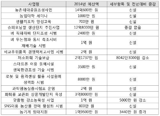 쌀 생산량 증대를 위한 기술 시범단지 조성과 스마트폰을 활용한 원예시설 원격제어시스템 시범사업 등의 농업 경쟁력 강화를 위한 다양한 사업 시도도 눈에 띈다.