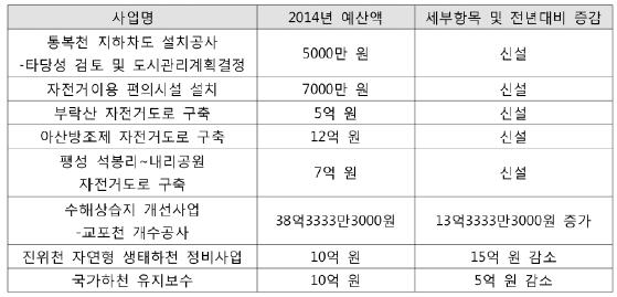 자전거 생활 활성화를 위한 다양한 사업도 눈에 띈다. 평택시 전역을 대상으로 자전거 보관대, 표지판, 볼라드 등 편의시설 설치비용이 7000만 원 계상됐다. 또한, 부락산 국제대학~흔치고개 일원 580m구간과 평택호 관광지와 연계한 아산만방조제 1.4㎞구간, 팽성 석봉리~내리공원간 2㎞구간의 자전거 도로 구축 사업이 신설된 것을 살펴볼 수 있다.