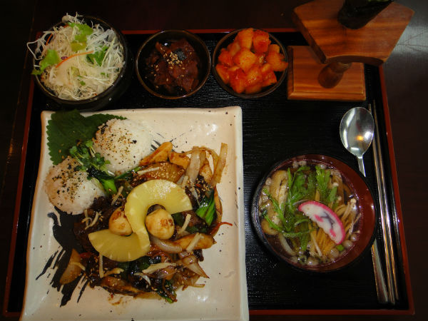 네모 반듯한 일인용 쟁반에 따끈하게 조리된 ‘비프 테리야끼’는 야채 샐러드, 미니우동, 깍두기, 장아찌, 알쌈 김말이로 구성되어 있다. 부드러운 쇠고기를 납작납작하게 저며 새송이 버섯, 양파, 청경채, 파인애플, 피망 등의 야채를 혼합하여 테리야끼 양념장으로 볶아낸 즉석음식이다. 완성된 음식 위에 얹혀있는 파인애플과 메추리알은 우선 시각적인 맛부터 선사한다.