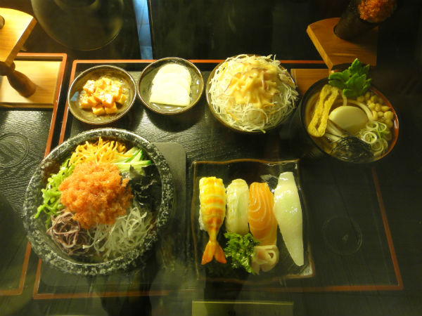 테리야끼 정식, 치킨 테리야끼 정식, 돈가스 정식(9000원), 메밀, 롤 세트, 덮밥, 도시락, 세트 메뉴, 특선 메뉴 등 다양한 메뉴가 있어 입맛대로 취향대로 선택의 범위도 넓다. 돈가스는 다른 냄새 없이 깔끔하고 알밥은 고소한 풍미가 솔솔 풍겨난다. 철판요리는 직장인들에게 인기가 있으며 각종 롤 요리는 여성들이 즐겨 찾는 요리로 인기를 끌고 있다.