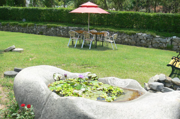 주차장을 가운데 두고 사이드에는 빨강, 파랑 파라솔이 놓여있어서, 시원한 바람과 함께 음식을 즐길 수 있도록 공간을 구성하고 있는데, 야외에서 음식을 즐기는 손님과 주차하는 차가 서로 불편하지 않도록 친근한 돌담을 쌓아 놓고 있다. 인테리어 효과로도 일품인 나지막한 돌담에서 주인장의 세심한 배려심을 느낄 수 있다. 야외 테이블을 지나 눈길을 조금 멀리 펼쳐보면, 자두나무랑 포도나무가 해질 녘 노을을 받으며 품은 열매들을 자랑하고 있고, 텃밭에는 토마토, 양상치, 치커리 등 샐러드 바와 전체 메뉴들 속을 누빌 식재료들이 무럭무럭 자라고 있다.