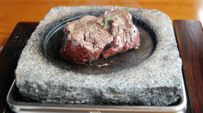 군침이 돌게 만든 스테이크는 2분 만에 완성되었다. 김이 오르는 것이 보일 정도로 달궈진 돌판 위에 안심을 한두 번 뒤집어서 짙은 갈색이 나올 때쯤 입맛에 따라 작게 잘라서 소금이나 데미 그라스 소스에 찍어 먹으면, 부드러운 고기 맛을 제대로 느낄 수 있다.