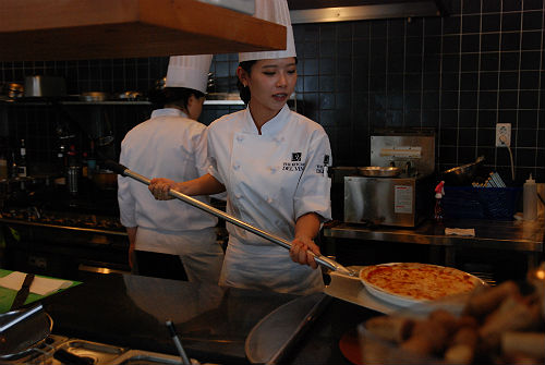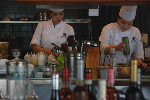 주방은 요리하는 모습을 잘 볼 수 있도록 열려 있어 보는 재미도 더해 준다. 열린 주방에서 가장 눈에 띄는 것은 벌건 불꽃이 올라오는 화덕이다. 숯불을 이용해 바로 구워내기 위해 마련했다고 한다. 얇게 편 반죽(dough)을 화덕에서 구워 내 기름기를 없애고 바삭한 식감과 담백한 맛을 더하는 게 특징이다. 반죽이 두터운 미국식 피자와 달리 12시간 냉장 발효시켜 화덕에서 구워내고, 그 위에 신선재료를 가미하여 자연스런 맛을 강조한다. 완전 발효한 반죽과 가게에서 하나하나 직접 만든 신선 재료로 요리하는 게 델 비노 피자 맛의 비결이란다.