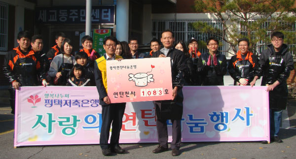 평택저축은행(대표 서순희)은-연탄천사 제1083호-지난 15일 동절기를 맞아 세교동 일대 기초수급가구 및 소외계층 5가구에 임직원 20명이 사랑의 연탄 및 방한용품을 전달하며 나눔의 온정을 펼쳤다. 평택저축은행은 2010년부터 매년 지역의 소외된 이웃들의 따뜻한 겨울나기를 위해 임직원이 한마음 한뜻으로 나눔으로 몸소 실천하고 있다.