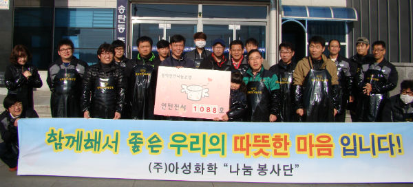 (주)아성화학(대표 이영상)-연탄천사 제1088호-은 지난 15일 평택연탄나눔은행에 사랑의 연탄 3000장을 전달하고 송탄동 일대 기초생활수급가구 및 독거노인 3가구에 연탄 900장을 직접 나르며 나눔의 온정을 펼쳤다. 아성화학(주)은 1977년 설립되어 정보통신 및 OA기기의 핵심기술에 해당하는 고무롤러 전문생산업체로서 지역사회에 다양한 나눔활동을 펼치고 있다.