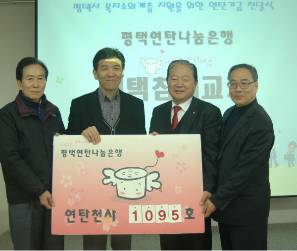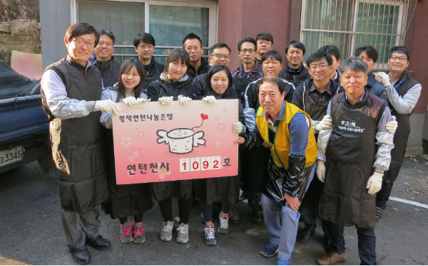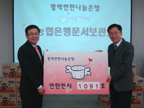 연탄천사 제1091호 째인 농협은행문서보관소(소장 주일선) 직원 일동은 지난 19일 지역의 어려운 이웃들의 따뜻한 겨울나기를 위해 평택연탄나눔은행에 직접 방문하여 사랑의 연탄 1000장과 함께 후원물품을 전달했다. 특히 이 날 전달한 사랑의 연탄기금은 농협은행문서보관소 직원들이 십시일반 모은 기금으로 관계자는 앞으로 나눔을 실천하는데 앞장 설수 있도록 노력하겠다고 말했다.