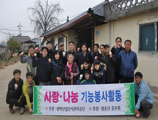 평택산업단지관리공단봉사단 회원 및 가족 19명이 참석한 가운데 송탄동 관내 홀로 어렵게 사시는 어르신 3가구를 방문해 1세대에는 현관 출입구 바람막이 공사를, 2세대에는 각각 연탄 500장씩 총 1000장을 전달했다.