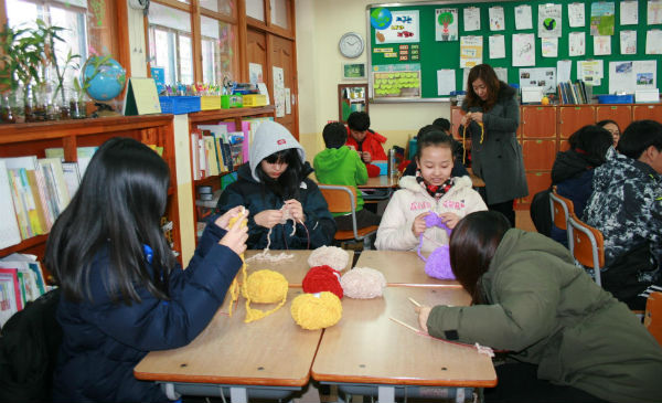 학부모회가 주최하고 뜨개동아리어머니들의 재능기부로 실과 시간과 창의적 체험활동 시간을 이용해 대바늘로 한 줄 한 줄 완성해 간 따뜻한 목도리는 지역 어르신들에게 직접 전해졌다.