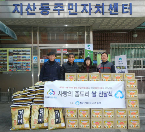 송탄새마을금고 지산본점(이사장 남상철)에서 지난 9일 새마을금고의 좀돌이 운동을 펼쳐 지역의 취약계층인 독거노인, 수급자 등 관내 어렵고 소외된 가정에 전해 달라며 쌀 34포(400kg)와 떡국 떡(200kg) 등 300여만 원 상당의 물품을 지산동 주민센터(동장 정연자)에 전달했다.
