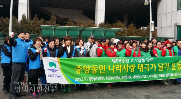 평택시 북부지역의 중심인 중앙동(동장 김태환)에서는 지난 17일 민관 합동으로 전 시민 태극기 달기 운동 캠페인을 전개했다.