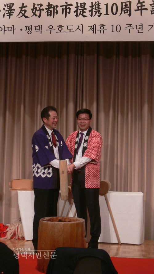 평택과 일본 에히메현(愛媛懸) 마쓰야마시(松山시)와의 우호교류 도시 협정 체결 10주년 기념식이 지난 2월 6일 일본 마쓰야마시 젠니쿠(全日空)호텔에서 한일 양국 관계자들이 참석한 가운데 성대하게 열렸다. 이날 기념식 겸 만찬장에는 평택시 공식 방문단을 이끌고온 공재광 평택시장과 노시 카스히토(野志克仁) 일본 마쓰야마 시장, 죠우코 토시후미(上甲俊史)에히메현 부지사, 김흥익 주히로사마 한국총영사관 부총영사 등 200여명이 참석했다. 이날 기념식은 미리 대기하고 있던 150여명의 일본측 관계자들이 입장하는 한국측 방문단을 기립 박수로 환영하는 것으로 시작돼 약 2시간 정도 화기애애한 분위기에서 진행됐다. 공식 행사 이후에 진행된 일본 전통 공연인 ‘메데타야’ 라는 일종의 떡치기 공연에서는 양 도시 시장이 서로 떡메를 내리치며 우호와 지속적 교류협력을 다짐했다. 평택시가 우호교류 협정을 맺은 자매도시와 10주년 기념식을 상대 도시 현지에서 극진한 환대 속에 진행한 것은 매우 이례적인 일이다.